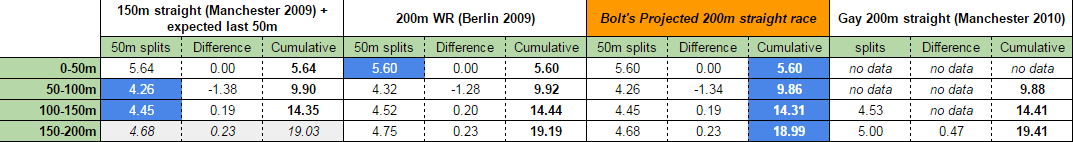 I will repeat, however, that Usain Bolt already had the potential to do it on a straight track. Below is a sheet with some of the splits from Bolt’s and Gay’s races and from that a projection of what Bolt could maybe run if he put together a near-perfect race. The times highlighted in blue are his fastest split times from his straight 150m and 200m WR runs. The first split is taken from Berlin’s 200m race and the next two are taken from Manchester’s run. The final 50m split of 4.68 is a fairly realistic projection of what he’d run if if he’d slow down 0.23 seconds from his previous split between 100 and 150m (like he did in Berlin).