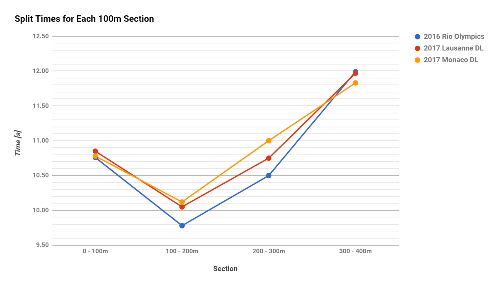 As always, note that these splits aren’t official and should — at best — be rounded to tenths instead of one-hundredths of a second. I used my own methods to estimate the splits using 50 fps videos of every race, but it’s impossible to get conclusive and 100% correct splits.